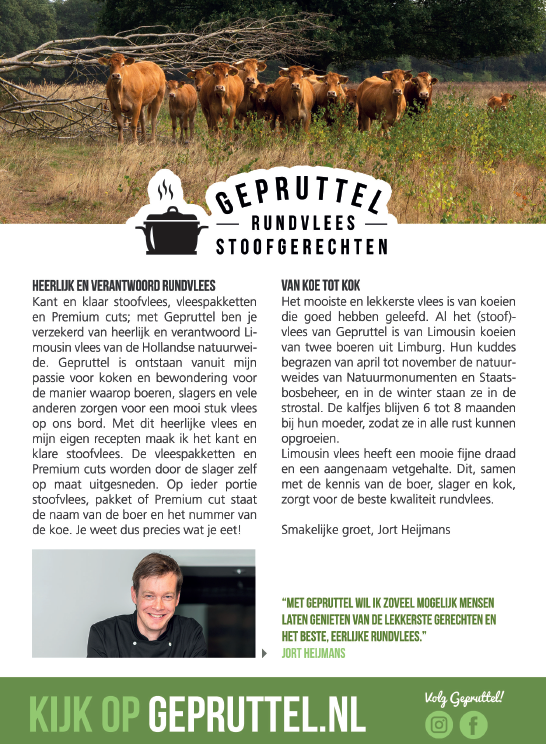 Veel consumenten zijn zich niet bewust hoeveel tijd, aandacht, moeite en liefde er schuil gaat in een stukje vlees. Dat wil ik veranderen met Gepruttel! Van elk stukje Gepruttel Limousin vlees is bekend van welke boer en koe het afkomstig is. De koeien lopen in de natuurweide en worden verzorgd door 2 geselecteerde boeren. Elke koe wordt op maat gevoerd voordat ze wordt geslacht, gegarandeerde topkwaliteit vlees dus. De lijnen met de zeer ervaren slager zijn kort net als de invries-tijd van het vlees. Alles voor optimale kwaliteit, smaak en dierwelzijn.